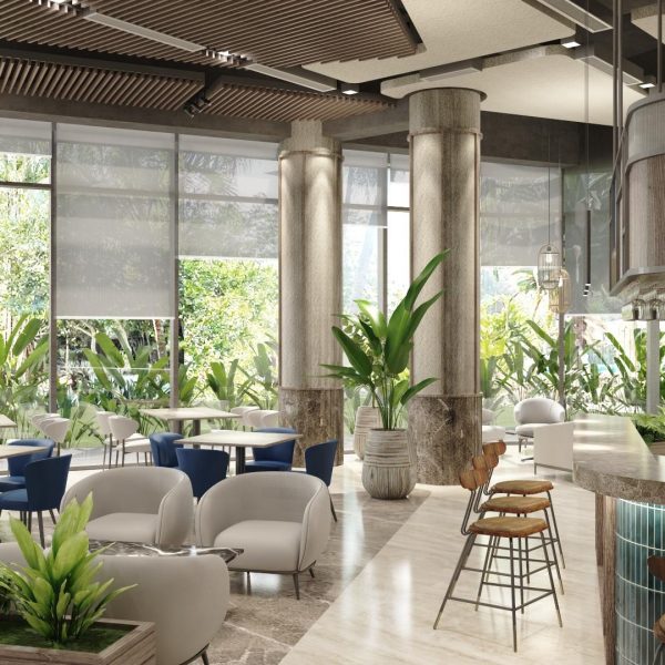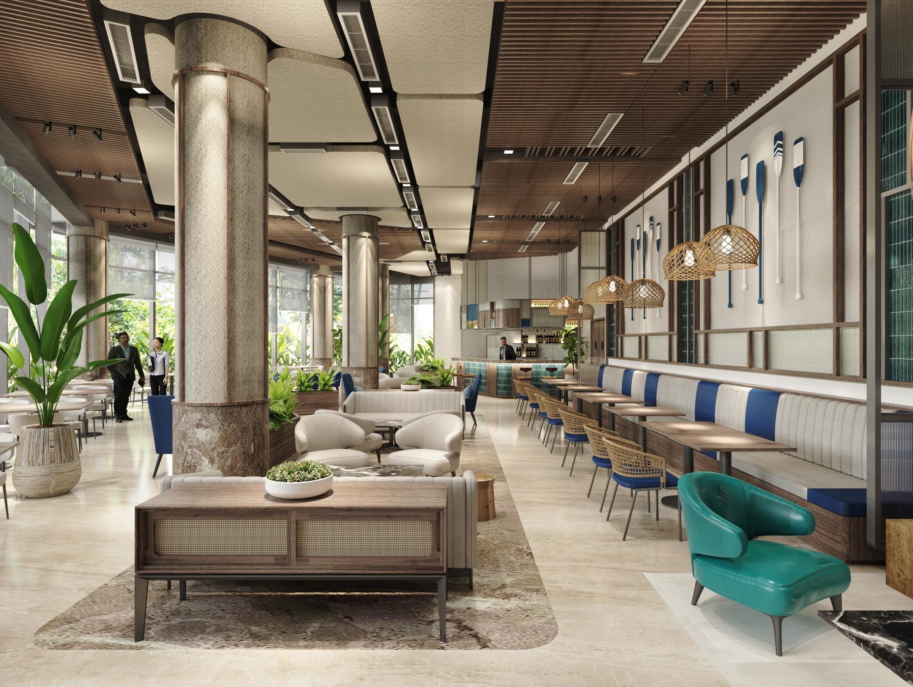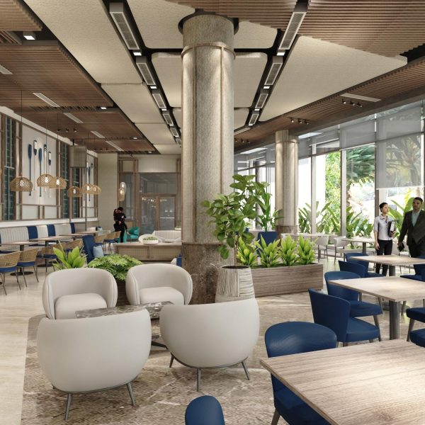 Inside the hotel lobby, you will encounter a sophisticated and luxurious space, containing all the elements to create a classy experience. The lobby floor is covered with luxurious carpet, creating a cozy and friendly feeling. Soft light from decorative lights highlights artistic details and unique interiors. The interior is carefully selected, with comfortable sofas and tea tables cleverly placed to create a comfortable space for visitors. Contemporary artworks decorate the walls, along with green plants creating accents and refreshing the atmosphere. All of these elements together create a luxurious and impressive hotel lobby space.